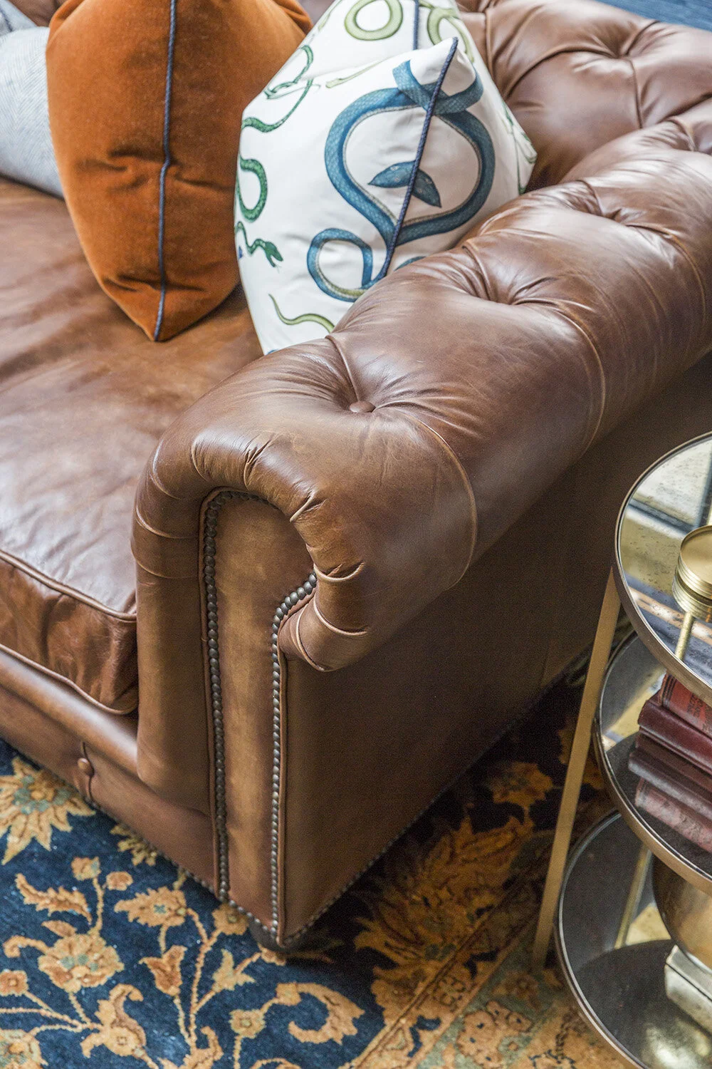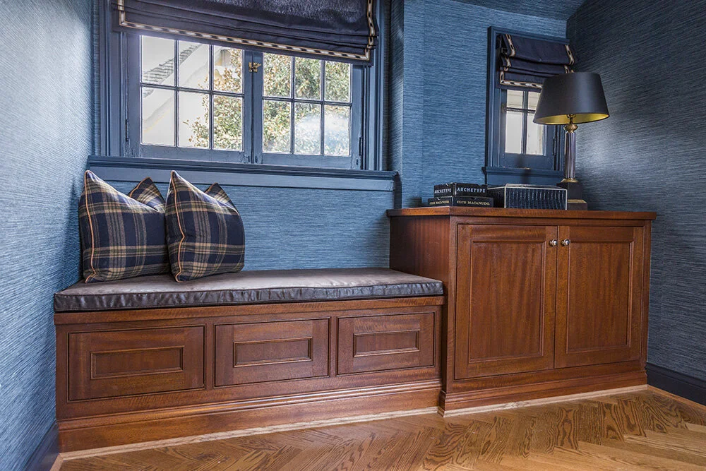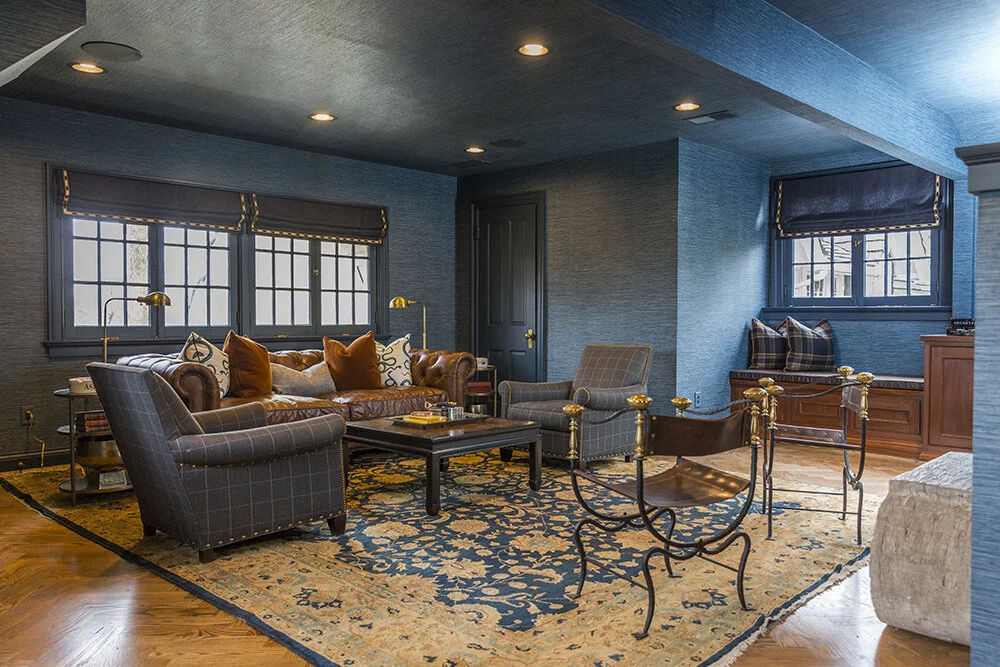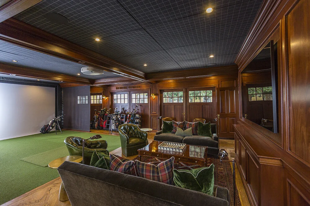 This remodel was a perfect exploration of how to mix rich, traditional tones to create an inviting and enthusiastic space for guests wanting to play a round of 18 holes…virtually. Pheasant wallpaper paired perfectly with a subtle geometric shade. Classic patterns like plaid are modernized when applied to the ceiling in this space. With many elements going on that catch the eye, this space is really pulled together through the custom traditional millwork in a rich mahogany. A golf simulator room is never complete without comfortable and classic chesterfield style lounge chairs, paired with rich brown velvet sofas.