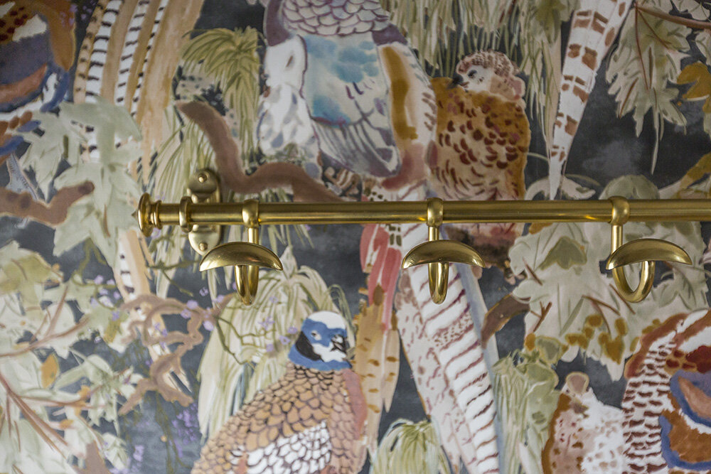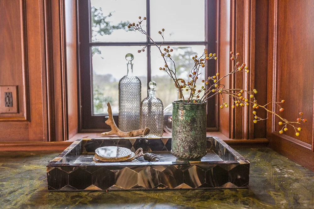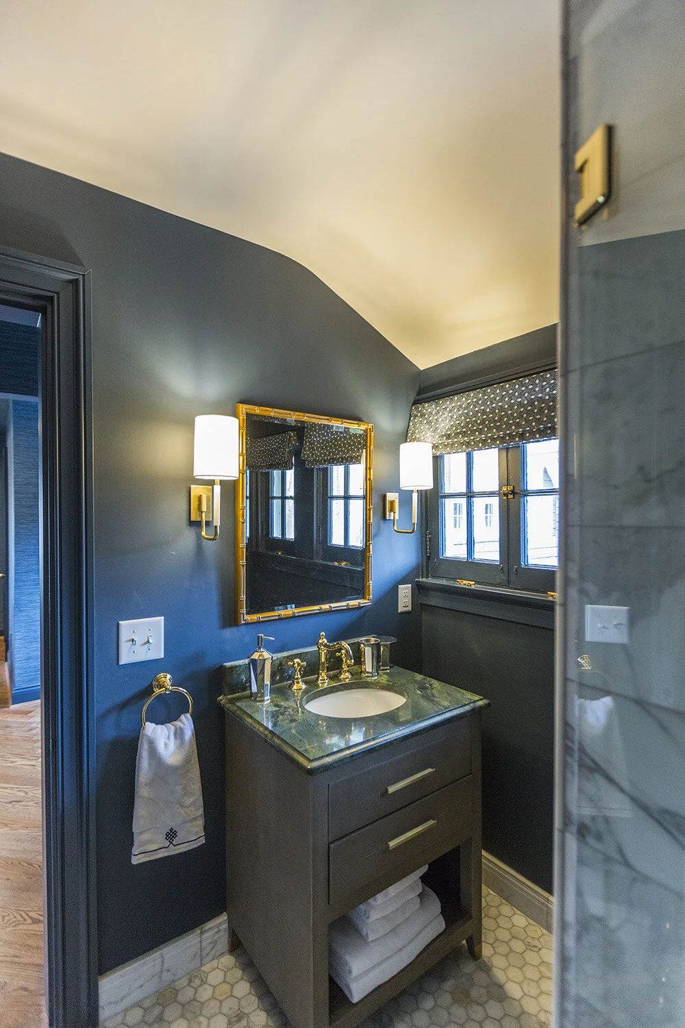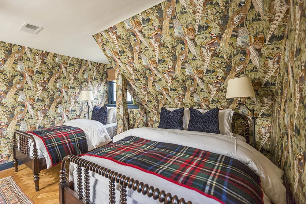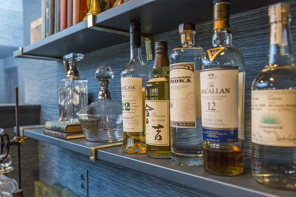 This remodel was a perfect exploration of how to mix rich, traditional tones to create an inviting and enthusiastic space for guests wanting to play a round of 18 holes…virtually. Pheasant wallpaper paired perfectly with a subtle geometric shade. Classic patterns like plaid are modernized when applied to the ceiling in this space. With many elements going on that catch the eye, this space is really pulled together through the custom traditional millwork in a rich mahogany. A golf simulator room is never complete without comfortable and classic chesterfield style lounge chairs, paired with rich brown velvet sofas.