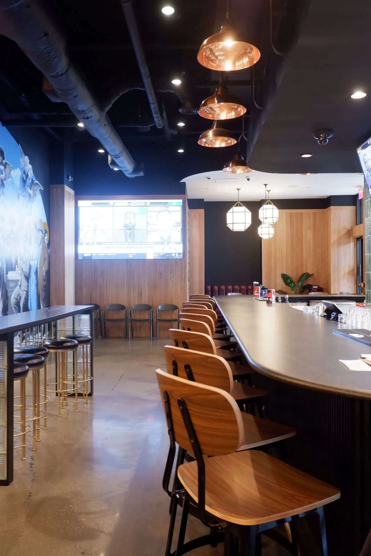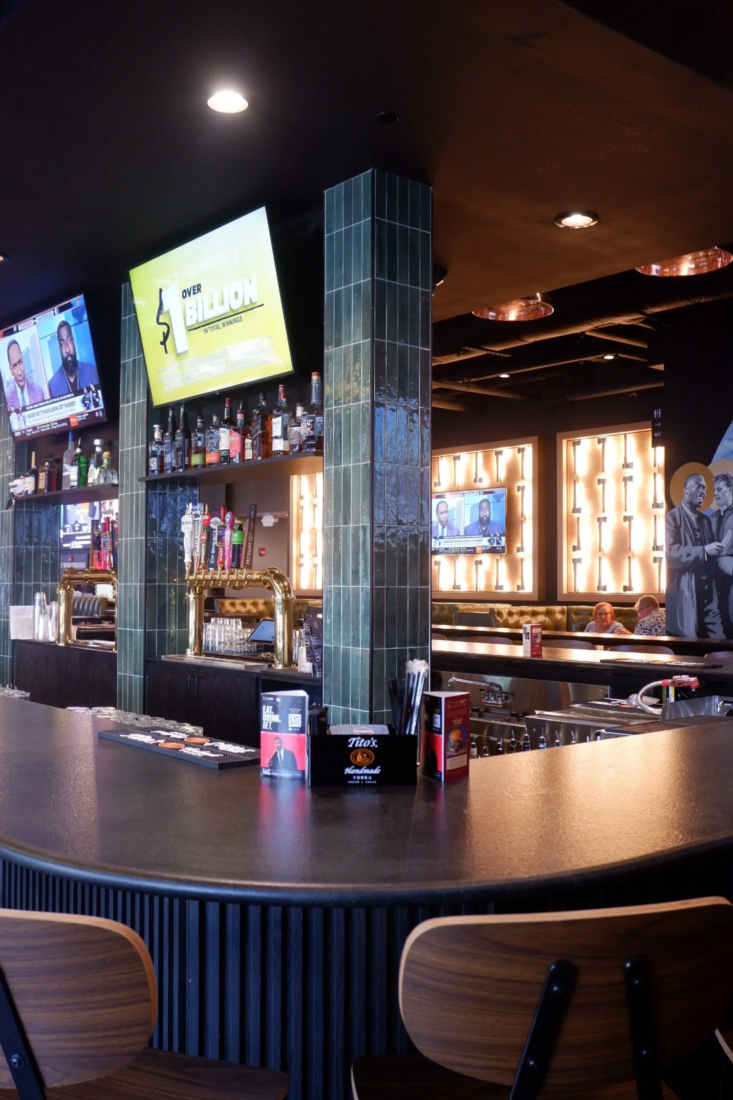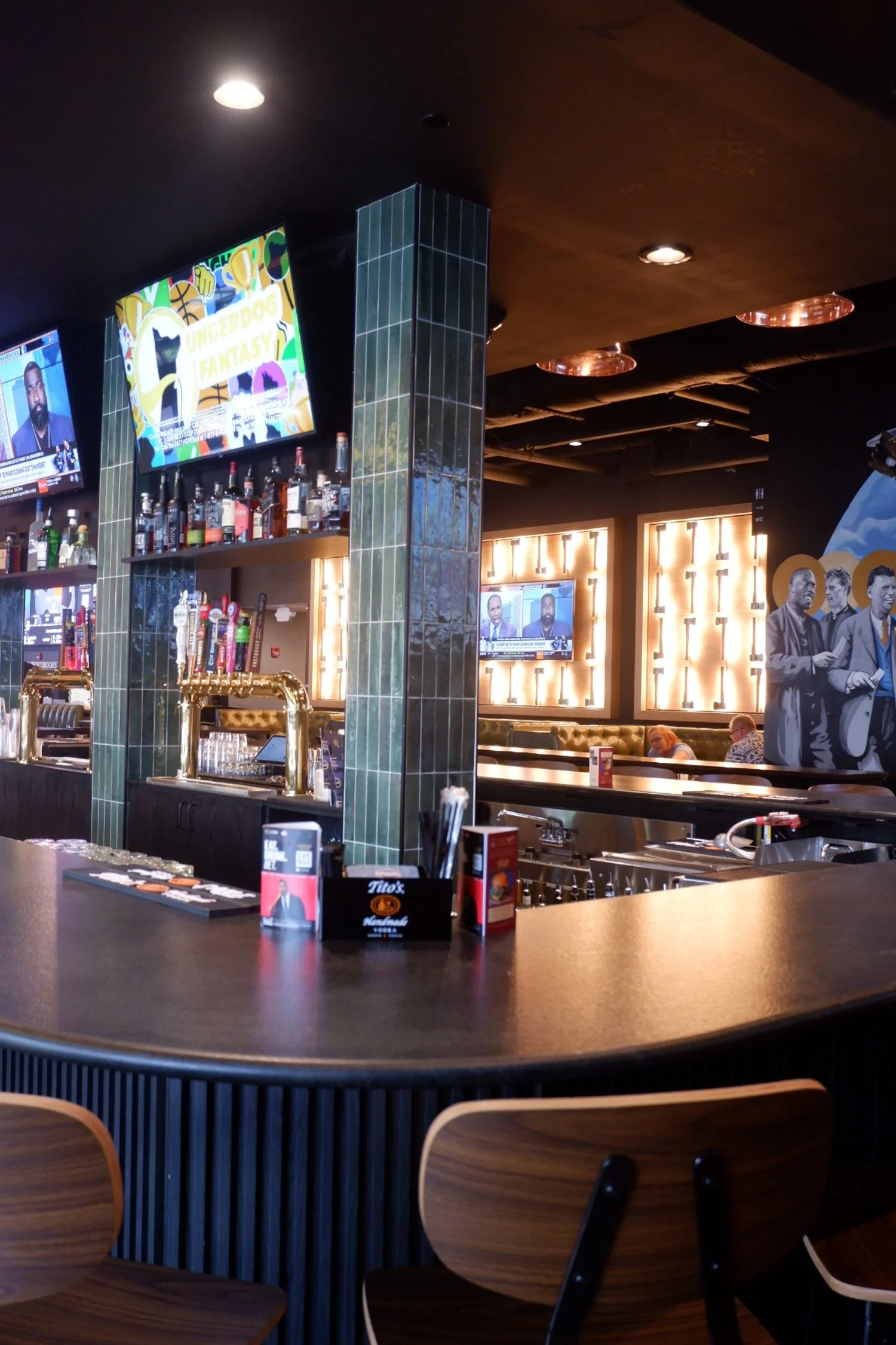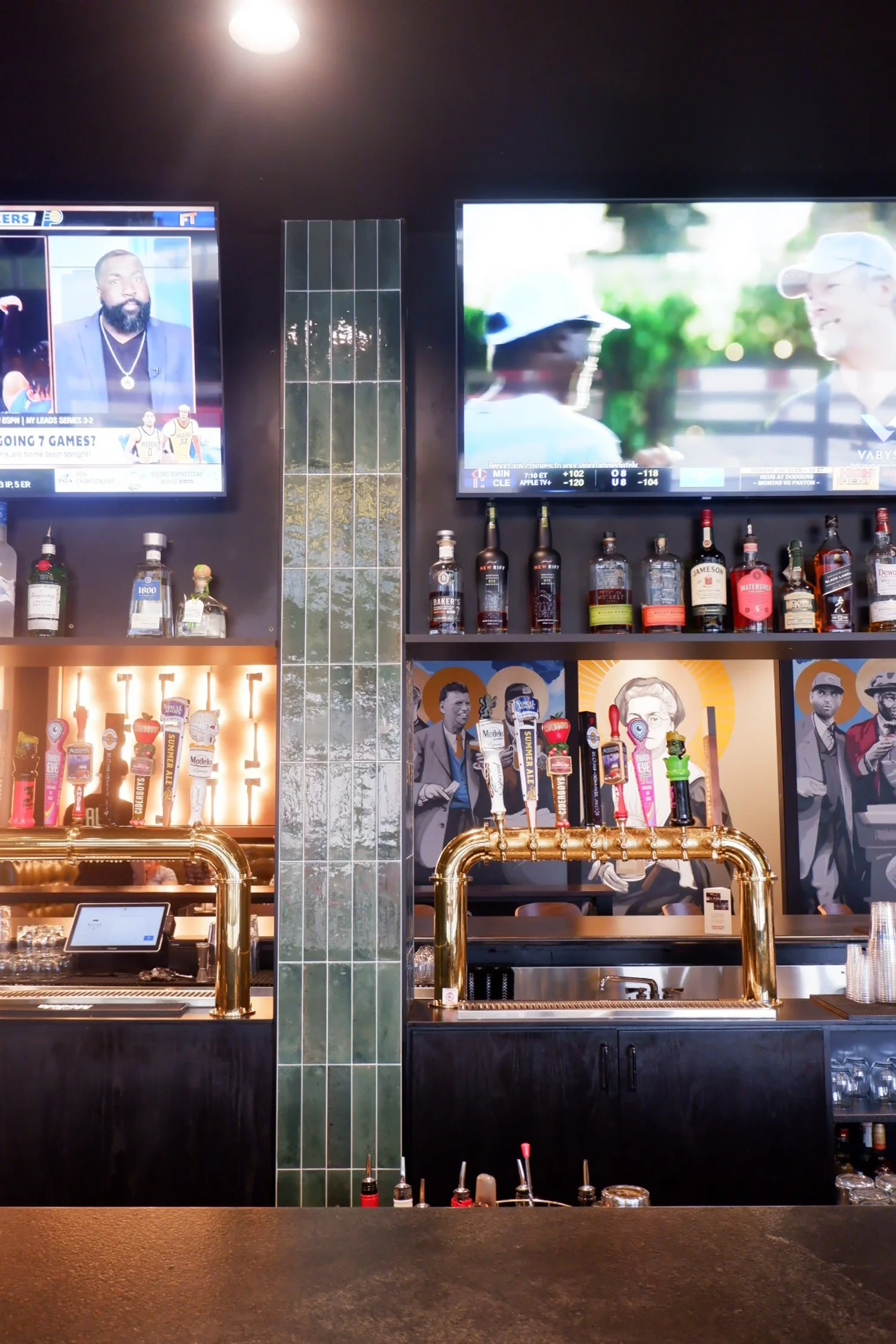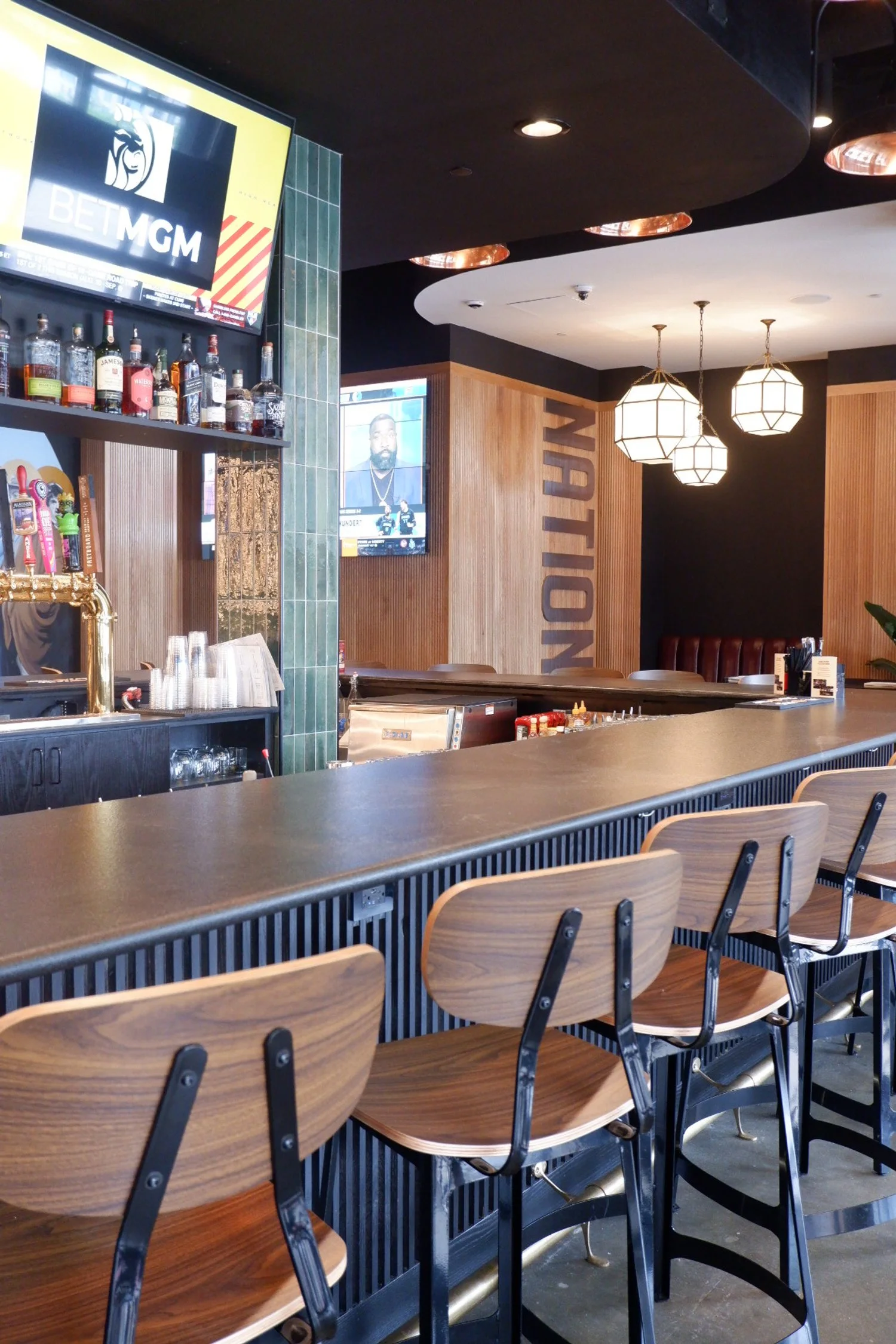 sportsbook betmgm x nation new bar in the heart of the banks in downtown cincinnati, oh. creating a luxurious feeling with elements of shiny metallics, custom backlit wall design, deep greens, and traditional upholstery details.
