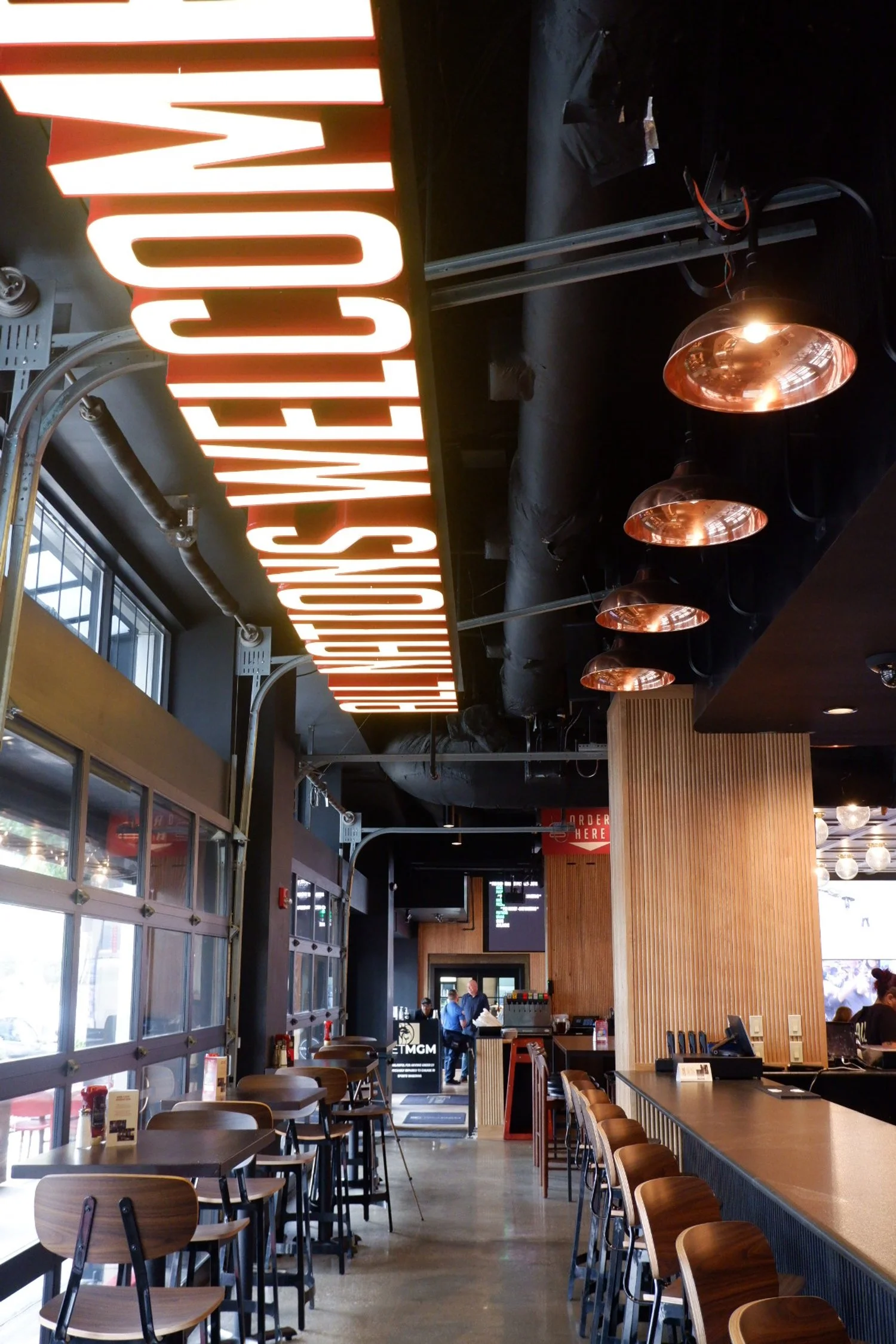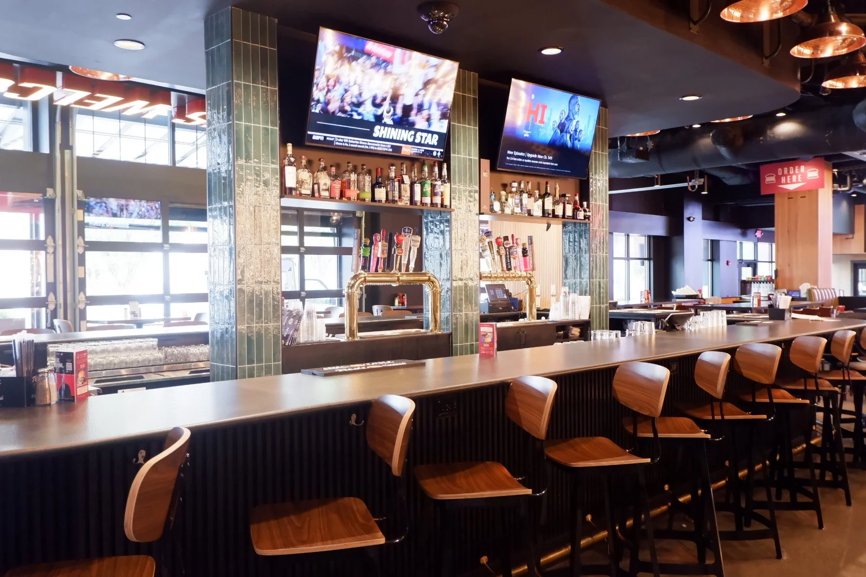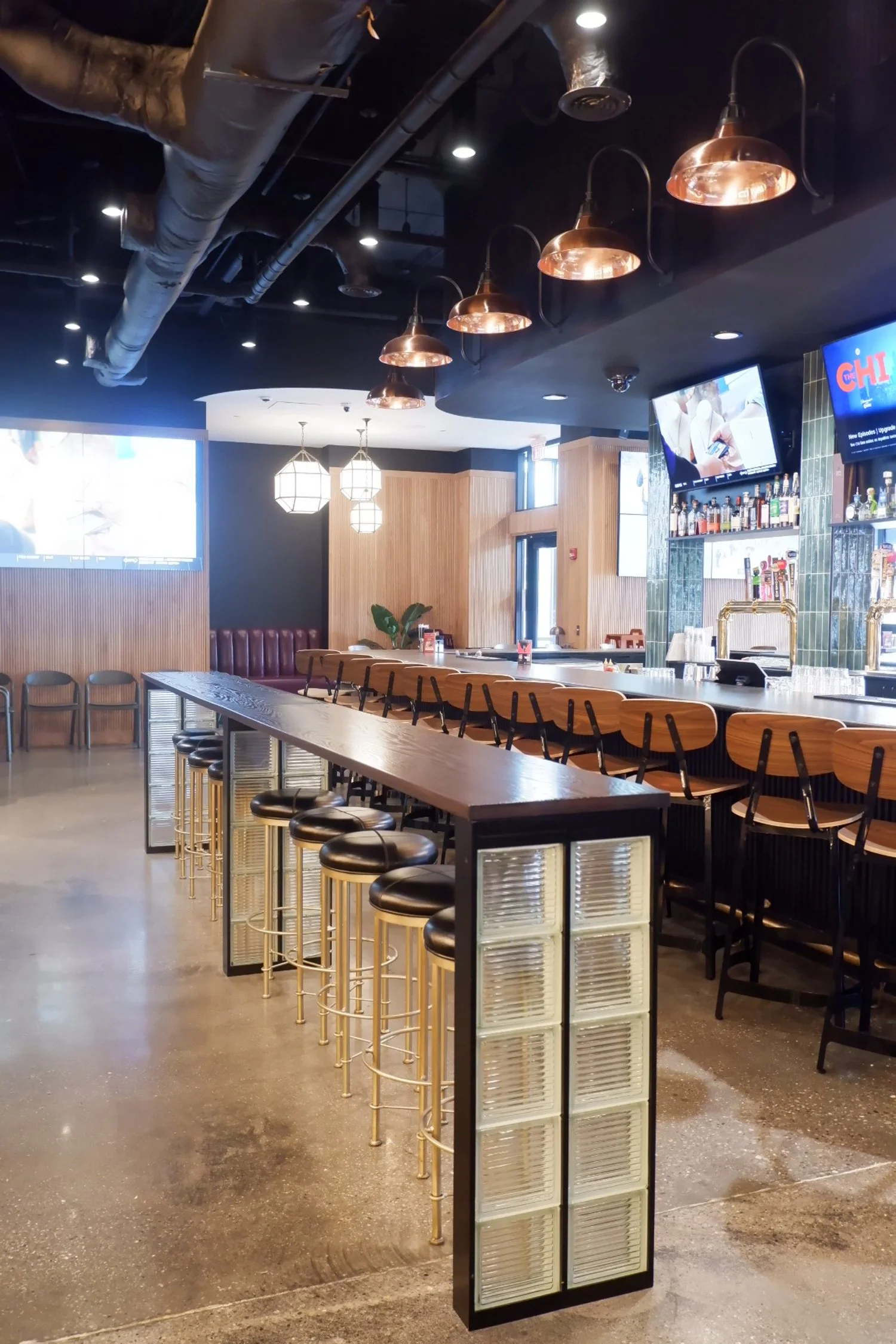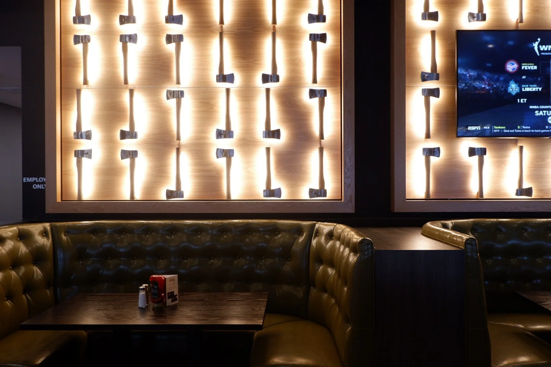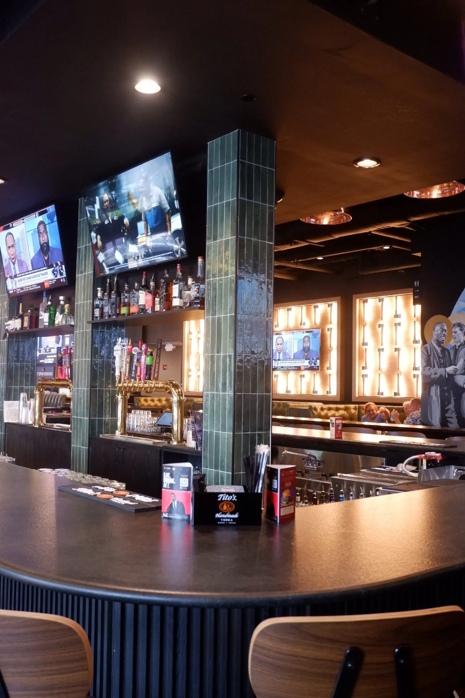 sportsbook betmgm x nation new bar in the heart of the banks in downtown cincinnati, oh. creating a luxurious feeling with elements of shiny metallics, custom backlit wall design, deep greens, and traditional upholstery details.