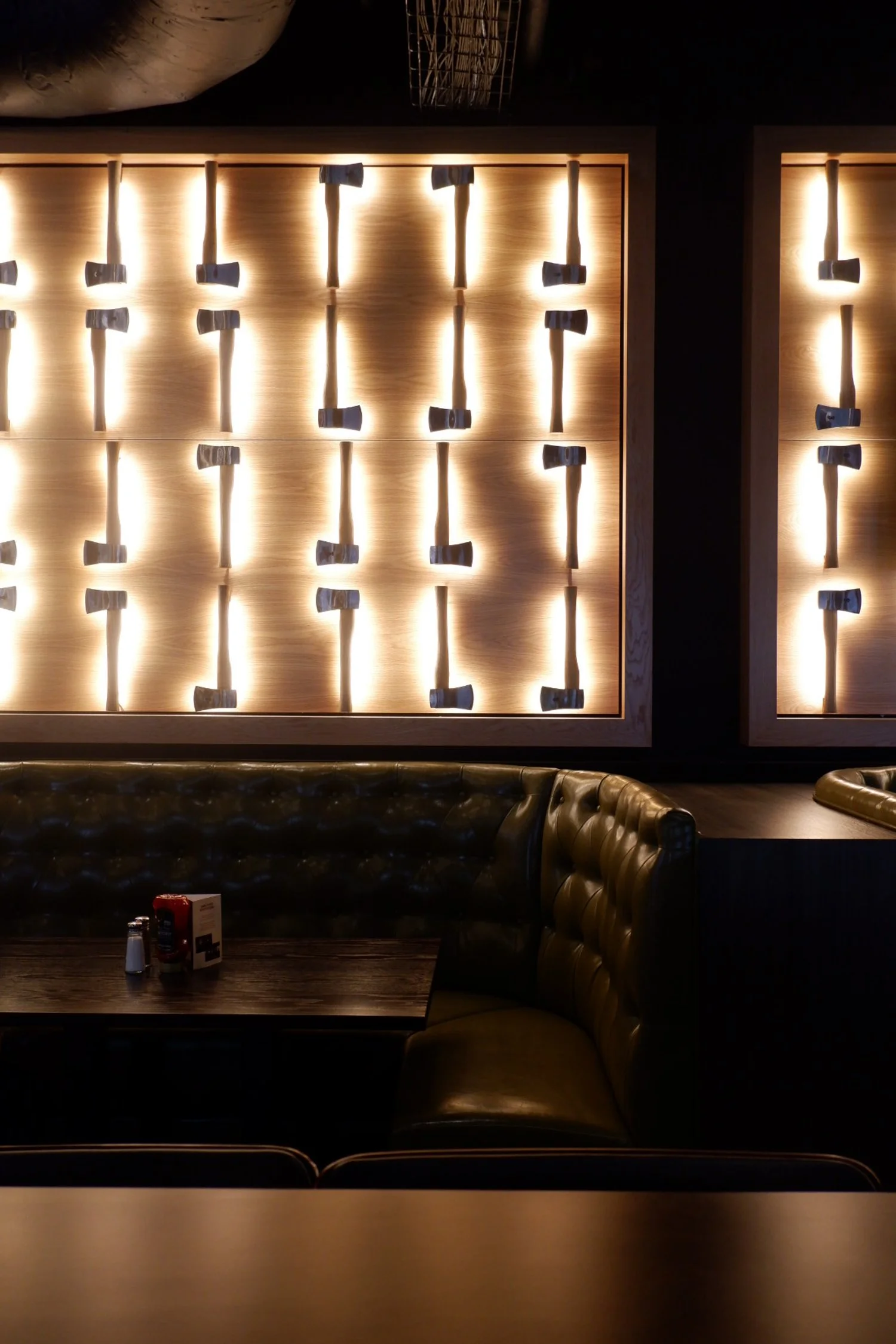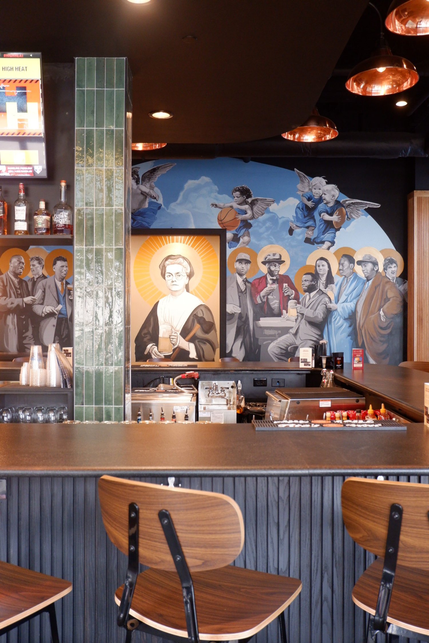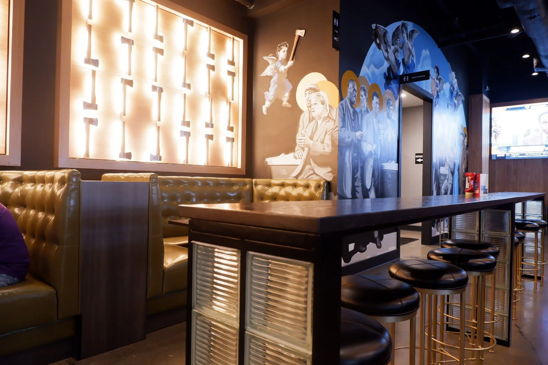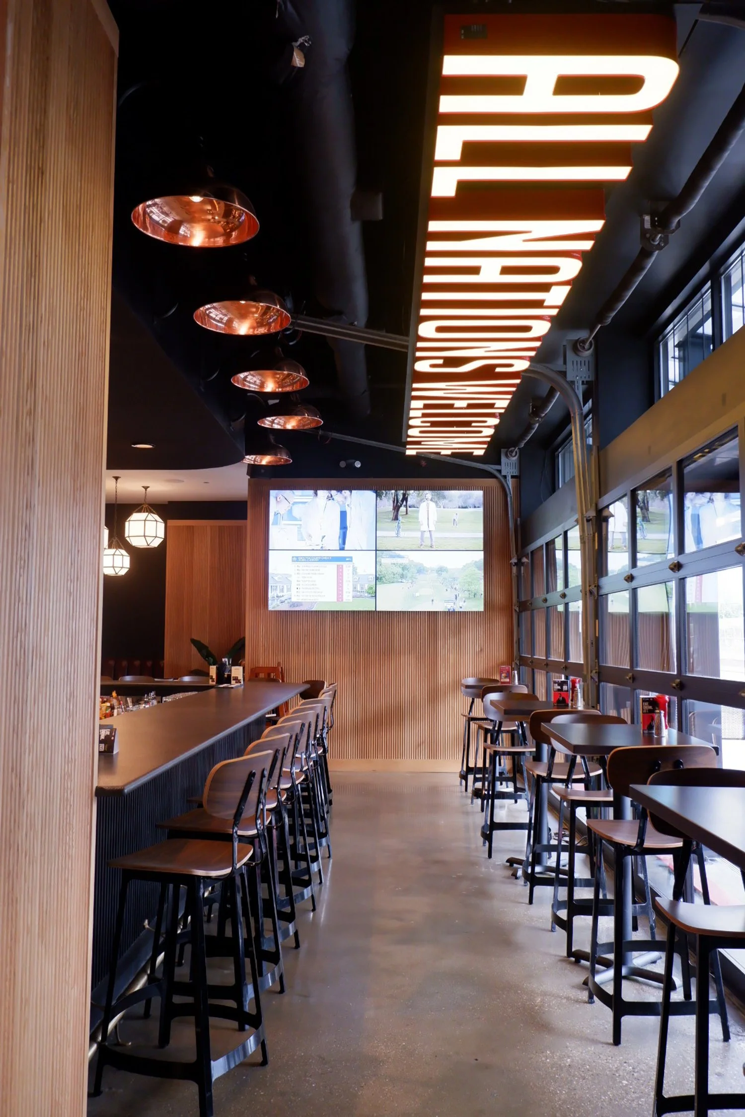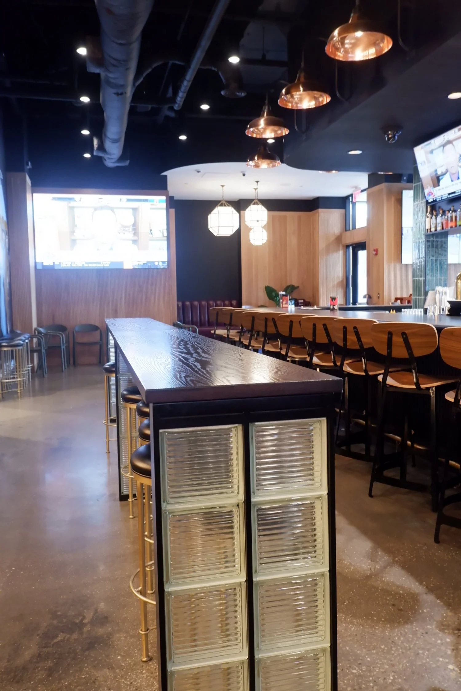 sportsbook betmgm x nation new bar in the heart of the banks in downtown cincinnati, oh. creating a luxurious feeling with elements of shiny metallics, custom backlit wall design, deep greens, and traditional upholstery details.